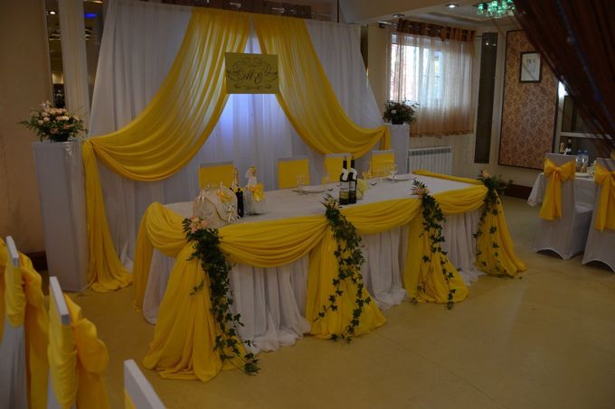 Ресторпн "21 ВЕК". 30 человек. В оформление входит: - оформление стола тканью и живыми цветами, - оформление заднего фона, - 2 стойки с живыми цветами, - оформление стульев чехлами и бантами, - оформление гостевых столов наперонами.