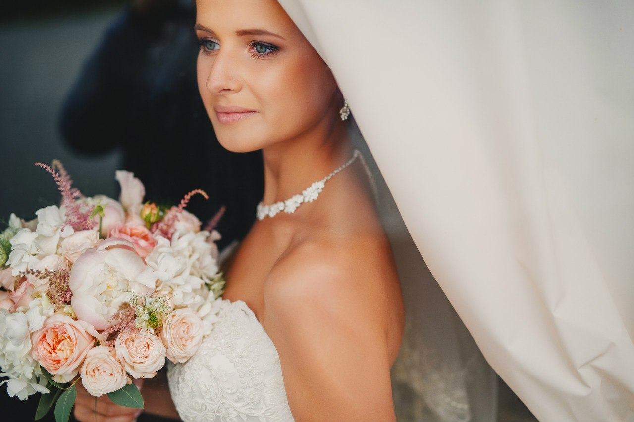 Нежный образ невесты дополнен букетом с пионовидными розами и пионами