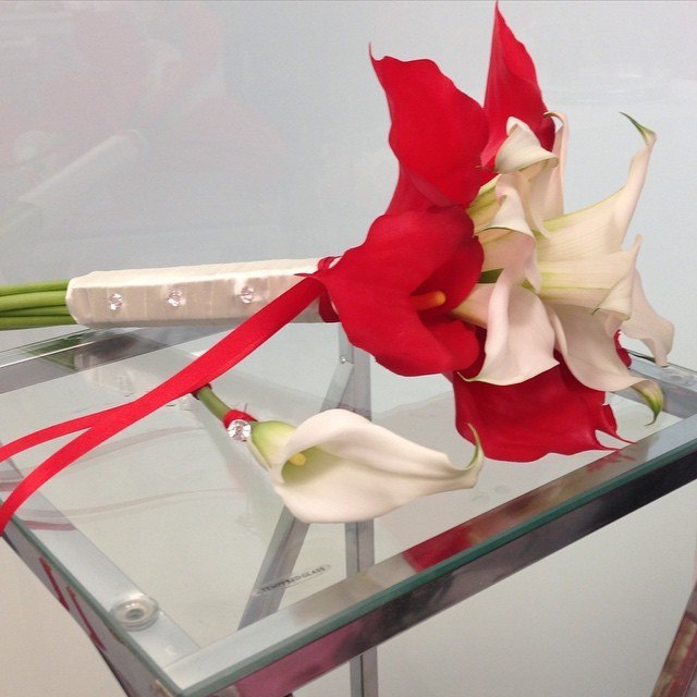 Букет Круглый букет Белый Каллы Красный Ленточка Бусины