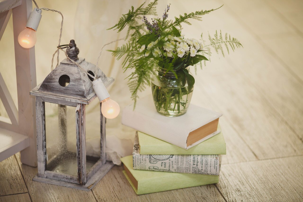 Оформление зала Книги Белый Декоративная ваза Зеленый Папоротник Серый Подсвечник