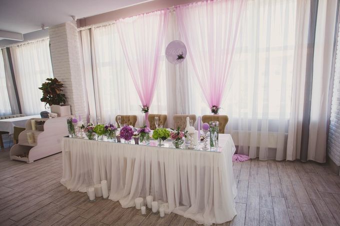 Оформление зала Белый Розовый Драпировка тканью Задник Президиум для молодоженов