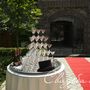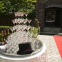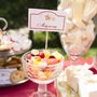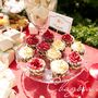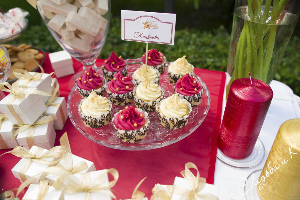 Капкейки, украшенные белым и розовым кремом, в цветных бумажных формочках, на стеклянной подставке