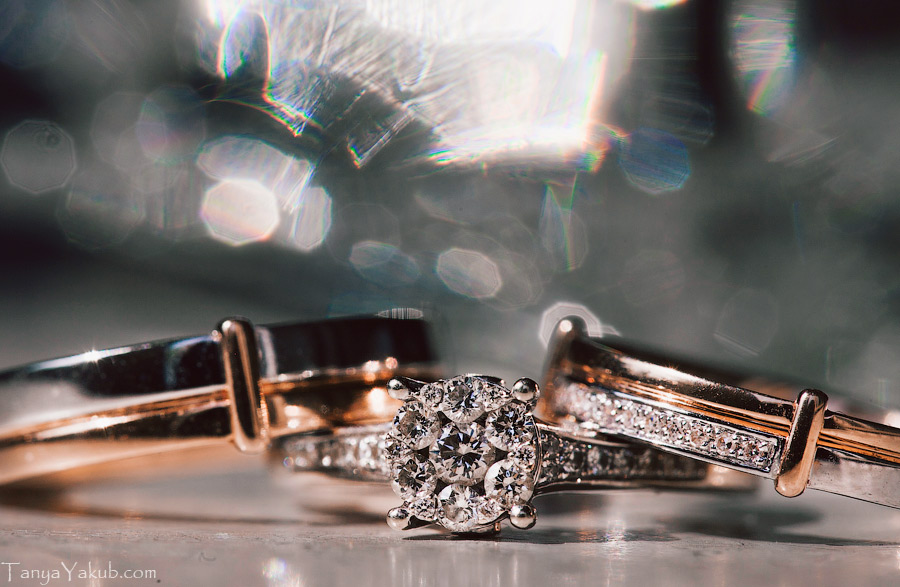 Обручальные кольца разных видов с бриллиантов на сияющем фоне.
