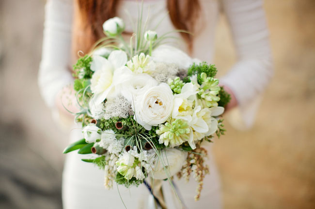 Букет невесты из белых ранункулюсов, абелии и амми, зеленых диантус гренни и белых стахиурусов в стиле рустик