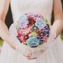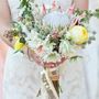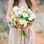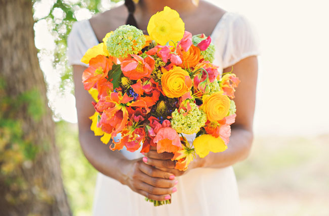 Осенний букет невесты из желтых ранункулюсов, салатового вибурнума, коралловых орхидей и маков