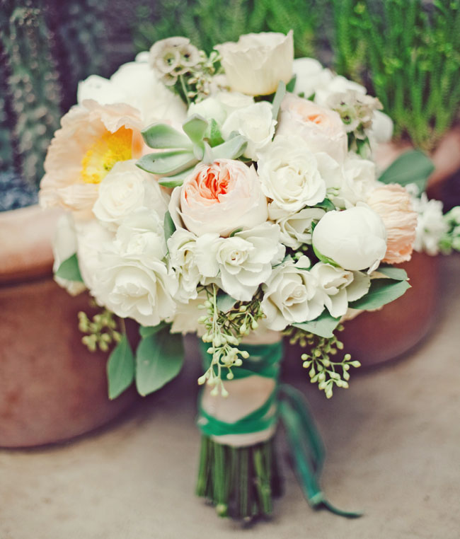 Букет невесты из белых и розовых роз сорта Дэвид Остин, зеленых суккулентов, розовых пионов, звездчатой скабиозы и зеленого котинуса, декорированный белой и зеленой лентой