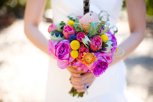 Яркий букет невесты из желтых краспедий, сиреневых и розовых пионовидных роз, оранжевых хризантем, зелени и розовой протеи  - фото 1183149 Свадебный распорядитель Дарья Емельянова