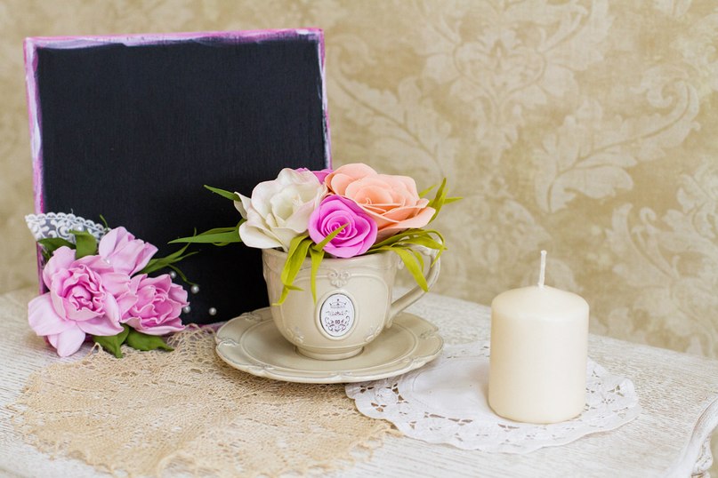 Оформление для фотосессии свадьбы в европейском стиле с использованием цветов в фарфоровой чашке, меловой доски, свечи на ажурной