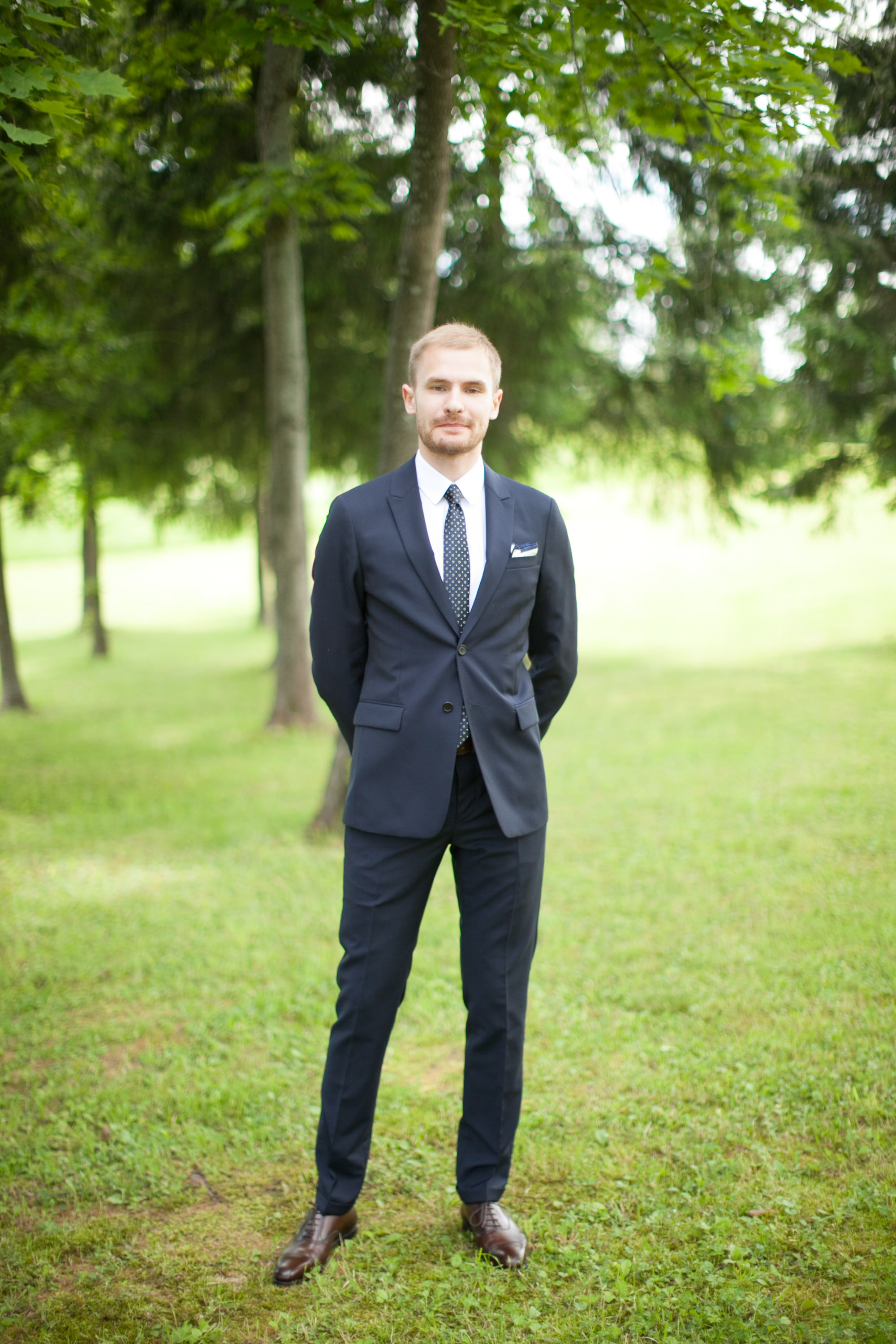 Классический синий костюм жениха "двойка" с белой рубашкой, синим галстуком и с белым платком в нагрудном кармане пиджака