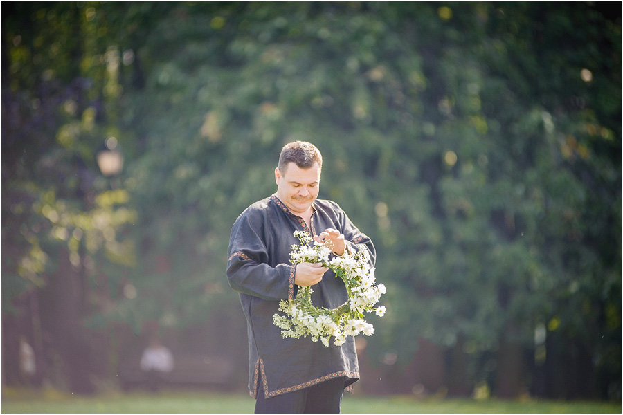 Жених в этническом стиле в широкой синей рубашке, черных брюках и с венком из полевых цветов