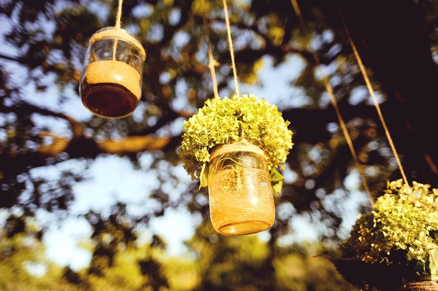 Оформление для фотосессии летней свадьбы в стиле рустик с использованием подвесных декоративных баночек с гортензией