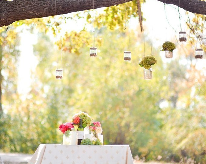 Под деревом, украшенным баночками с зеленью, стоит маленький столик с вазами розовых цветов