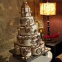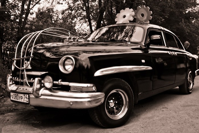 Старинный ретромобиль, украшенный шестеренками вместо обручальных колец на фоне зелени парка.