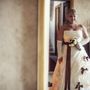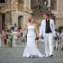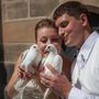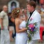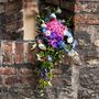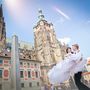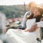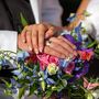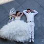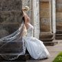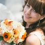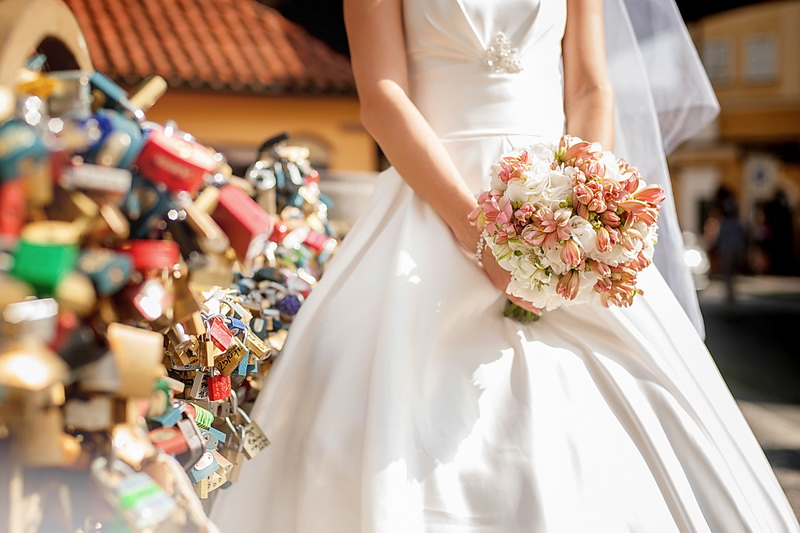 Невеста в белом пышном атласном платье с букетом в руках из розовых альстромерий и белых гортензий