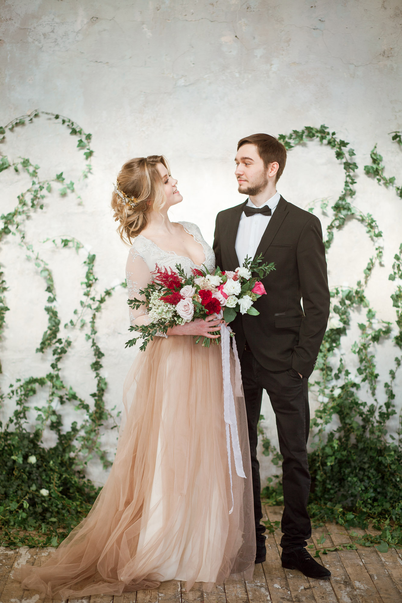 Букет Букет произвольной формы Белый Ленточка Айвори Роза Красный Астильба Зеленый Эвкалипт