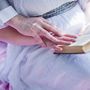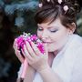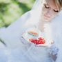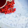 Невеста держит в руках чашку с блюдцем и ягодами рябины