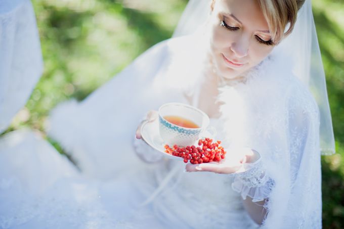 Невеста держит в руках чашку с блюдцем и ягодами рябины