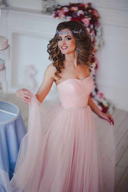 Платье Розовый Длинные А-силуэт Фатин Корсет Открытый верх Белый Стразы Пояс на талии