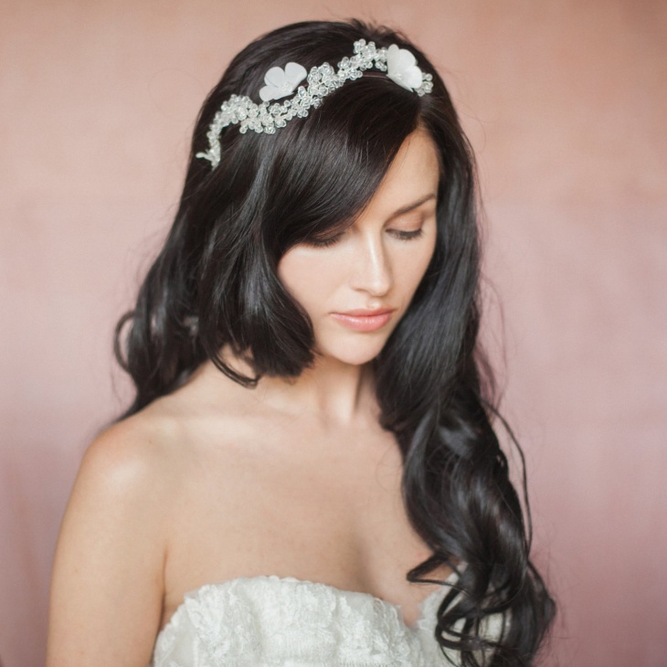 Длинные распущенные локоны невесты украсил ободок, декорированные перламутровыми бусинами и жемчужно-серыми цветами