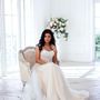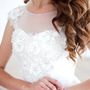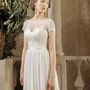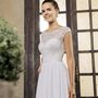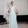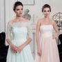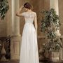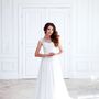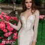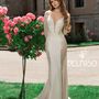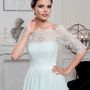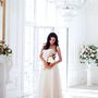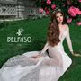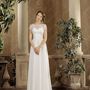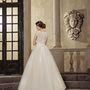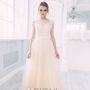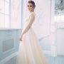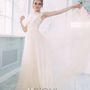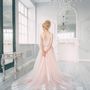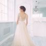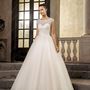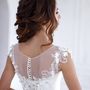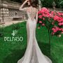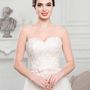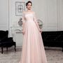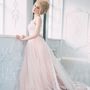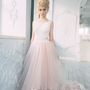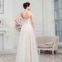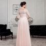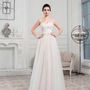 Необычное платье цвета легкой пудры.Юбка платья покрыта легкой фатиновой тканью со шлейфом.Изящное декольте в виде сердечка почеркнет красоту бюста невесты,а опоясывающее талию жемчужное обрамление делает платье еще более шикарным и великолепным