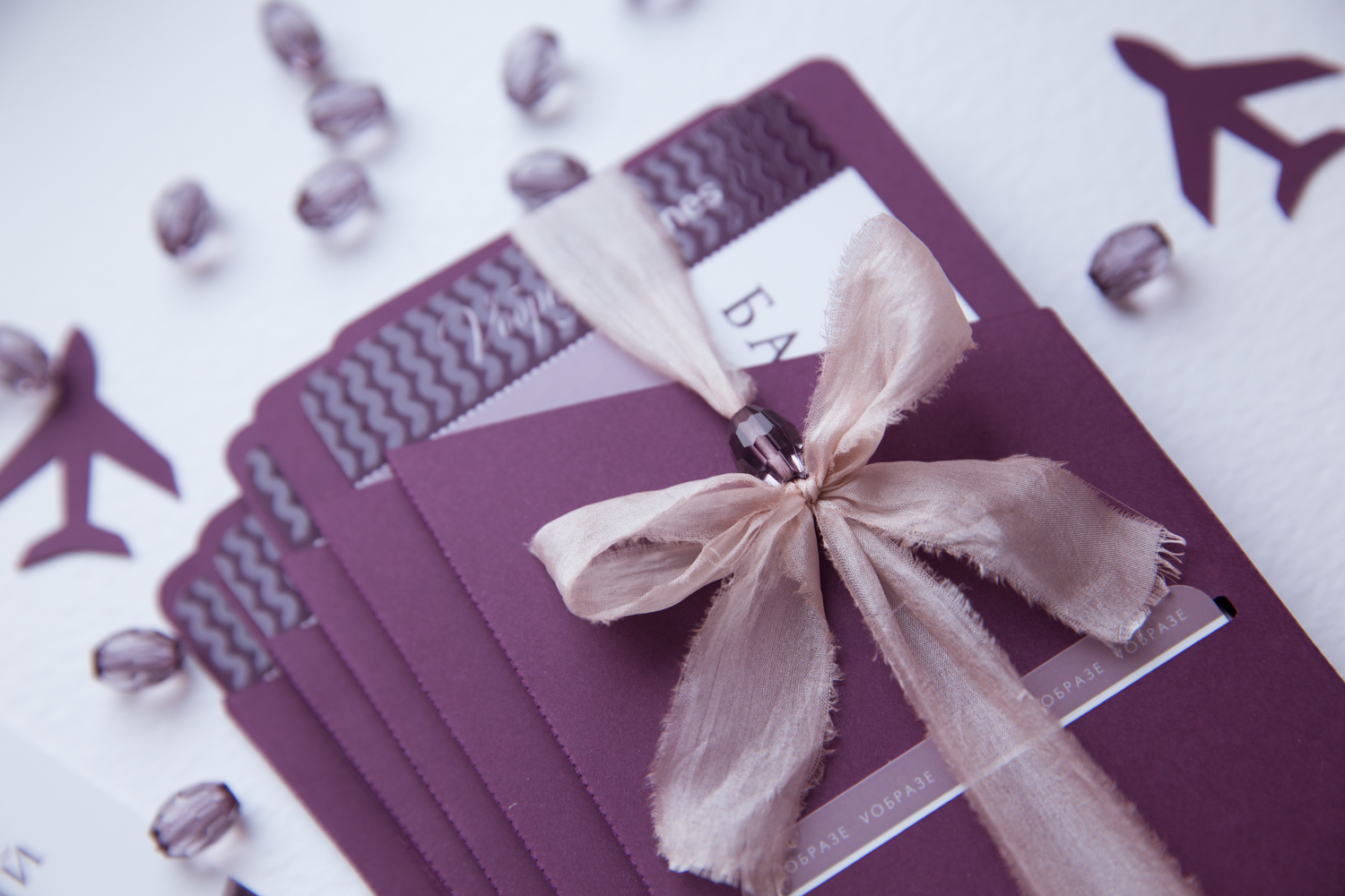 Роскошные приглашения на закрытую вечеринку салона красоты. Приглашение выполнено в виде билета на самолет, использована выборочная лакировка, объемный конверт винного цвета с марками, украшенный шелковой лентой. - фото 15828720 Фотограф и графический дизайнер Анастасия Линок