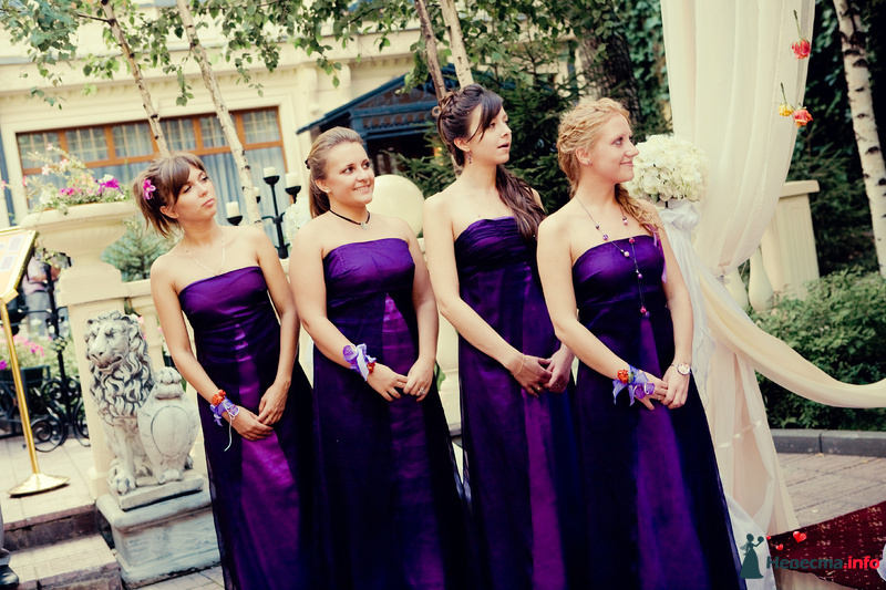 Белое здание. Березы. Арка, украшенная белой тканью и белыми цветами. Подружки невесты в одинаковых фиолетовых длинных платьях с вырезом корсаж, от завышенной линии талии треугольный клин светло-фиолетового цвета. У девушек в европейском стиле одинаковые браслетики на светло-фиолетовых лентах с красными цветами