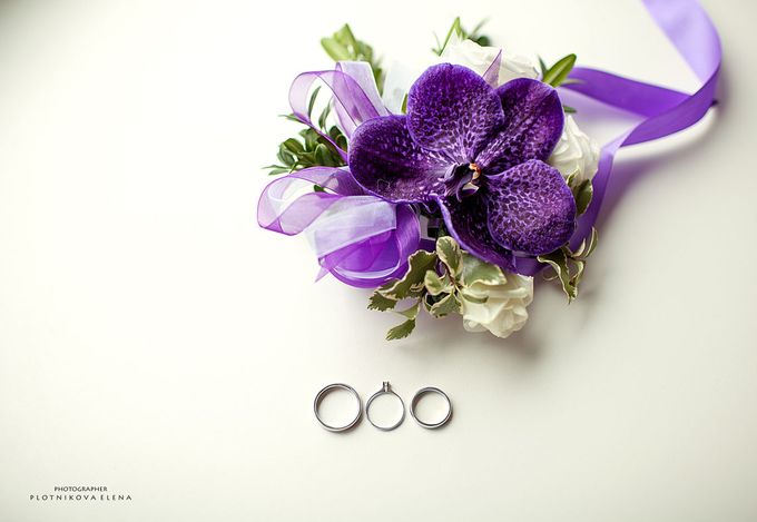 Свадебные кольца и бутоньерка из сиреневой орхидеи, белых роз, зеленых листьев лигуструма и зелени, декорированная сиреневой и
