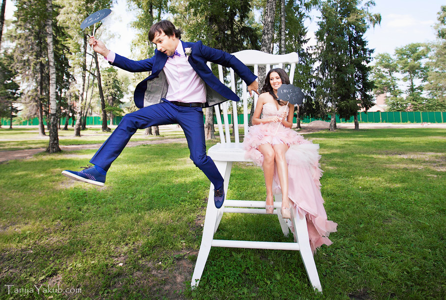 Жених перепрыгивает через большой стул, на котором сидит невеста