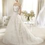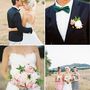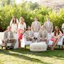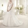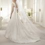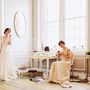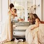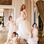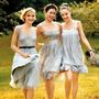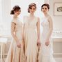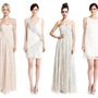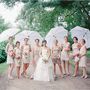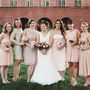 Невеста в белом длинном платье с гипюром, вырезом Анжелика и подружки в платьях с белым лифом без рукава и с коротким рукавом, с