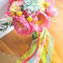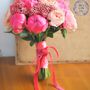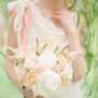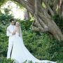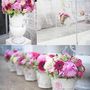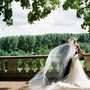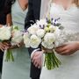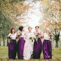 Невеста в белом длинном платье с гипюром, вырезом Анжелика и подружки в платьях с белым лифом без рукава и с коротким рукавом, с круглым вырезом горловины и в длинных сиреневых атласных юбках на широком поясе с букетами в руках