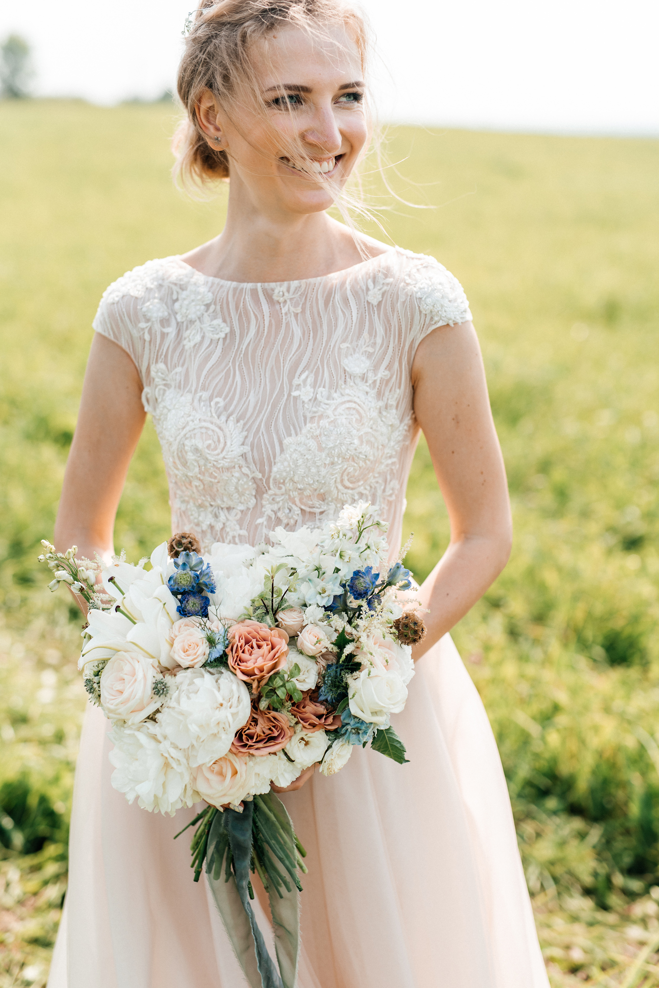 Букет Букет произвольной формы Серый Ленточка Белый Пионы Розовый Роза Коричневый Звездчатая скабиоза