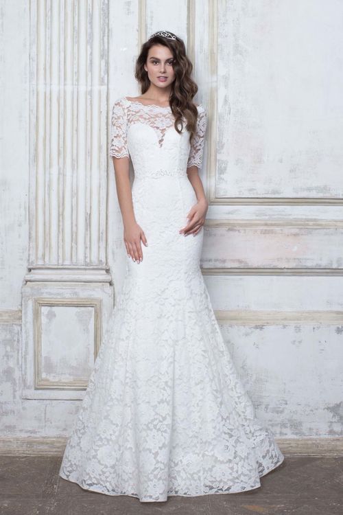 Очень эффектное белоснежное свадебное платье выполнено из эластичного кружева с обезоруживающими линиями силуэта «годе». Небольшие прозрачные рукавчики, красивый вырез на спинке и небольшой шлейф дополнят образ. Подробности тут: