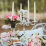 Оформление для фотосессии на свадьбе в европейском стиле с использованием серебристого подсвечника, стеклянных вазонов с цветами,
