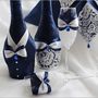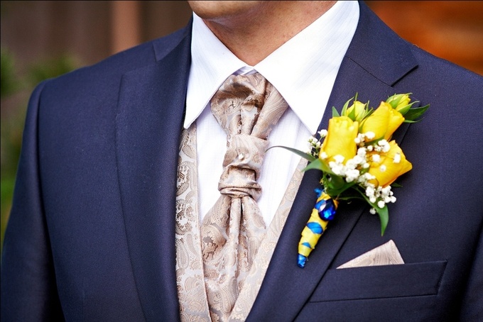 Бутоньерка из желтых роз, белой гипсофилы и зеленых листьев котинуса, декорированная голубой и желтой атласными лентами и дополненная синим камнем, в петлице синего пиджака