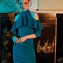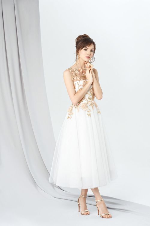 Модель EMSE 0252 Короткое свадебное платье приталенного силуэта с отрезной линией талии на корсетной основе длинной ниже уровня колена. Платье с кружевной майкой по лифу и круглым вырезом горловины. Юбка солнце в несколько слоёв фатина и красивой кружевно