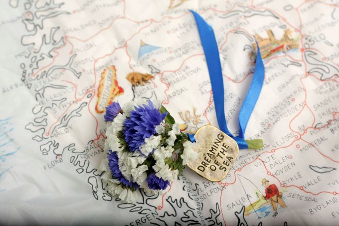 Бутоньерка из синих васильков и цветов белой статицы, завязанная синей атласной лентой с декоративной биркой
