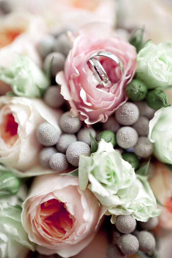 Обручальные кольца, одно из которых с бриллиантами и гравировкой на фоне букета цветов.