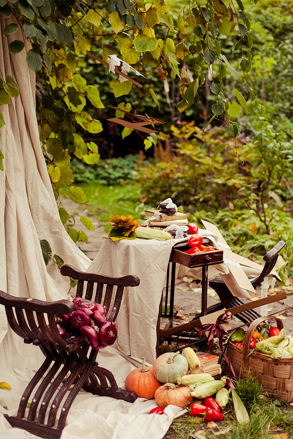 Оформление фотосессии осенней свадьбы: стол, украшенный белым полотном, книгами, осенними листами,овощами, ветка дерева укаршена