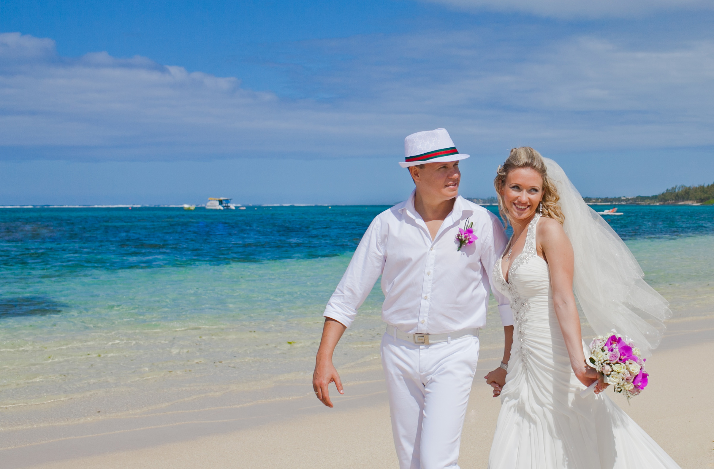 По пляжу идут жених и невеста, держась за руки, он в белой шляпе и белом костюме, она в белом, длинном платье со шлейфом и