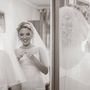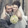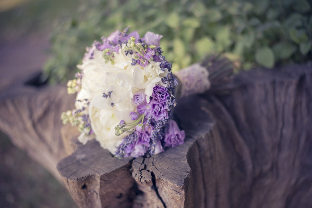 Букет невесты в стиле прованс из белых пионов, сиреневых эустом, лаванды и матиолы, декорированный белым кружевом