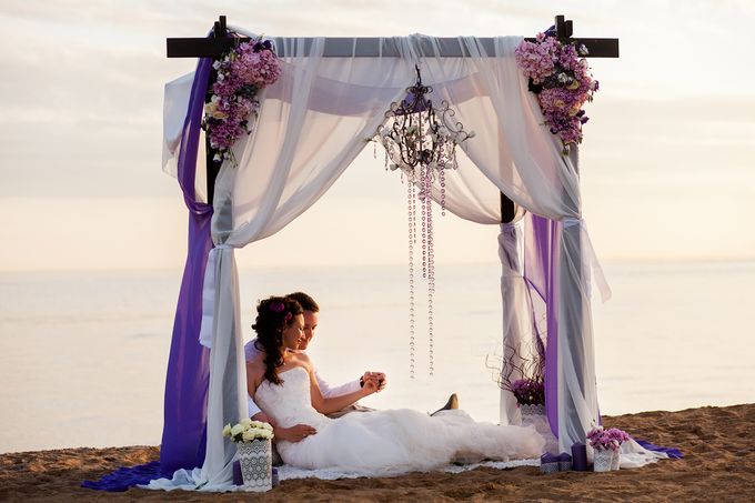 На пляже, в беседке сиреневого тона, сидят жених и невеста, взявшись за руки, она в белом пышном платье