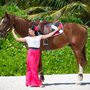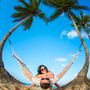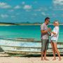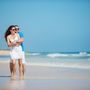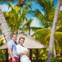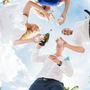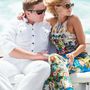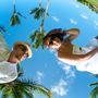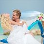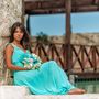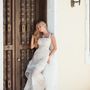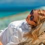 На крепостной стене на фоне голубого неба с белыми облаками стоит подружка невесты с белыми длинными распущенными локонами, в голубом приталенном платье в пол. Девушка в солнцезащитных очках, в европейском стиле, в ярком солнечном свете