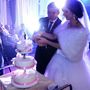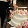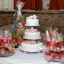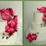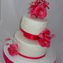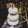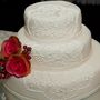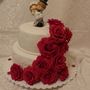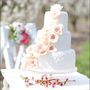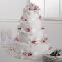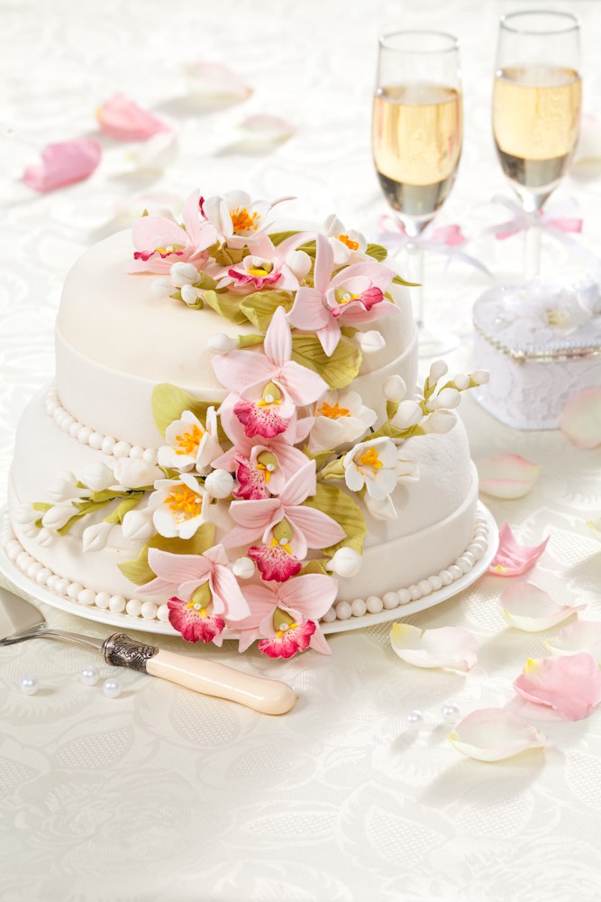 Белоснежный свадебный торт украшен каскадом фантазийных цветов из сахарной пасты и съедобным жемчугом