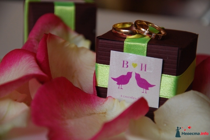 Коробочка боньбоньерка, подарок для гостей, в коричневом тоне, с атласной лентой зелёного цвета. В даном случае служит подставкой для обручальных колец. Украшена белой атласной карточкой с изображением двух розовых приц, инициалов и даты свадьбы