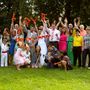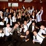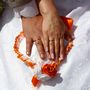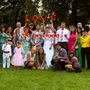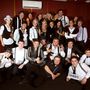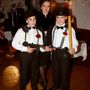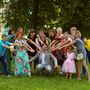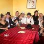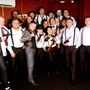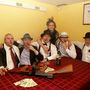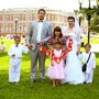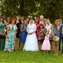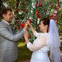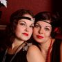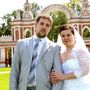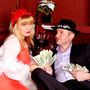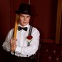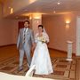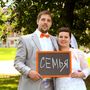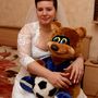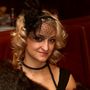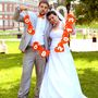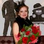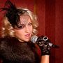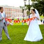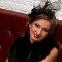 На плечах невесты песцовая накидка, на шее длинная нитка чёрных бус а причёску украсила чёрная шляпка вуалетка на атласном ободке с цветком и перьями