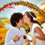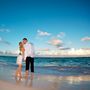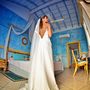 Невеста в коротком платье, перевязанном синей ленточкой лежит на массивной ветке тропического дерева и держит в руке прозрачную фату, развевающуюся на ветру, жених стоит рядом на песке в белой рубашке и смотрит с умилением на возлюбленную