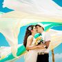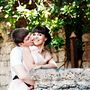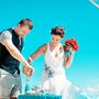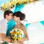 Под сводом свадебного шатра из бамбука, украшенного в бело-голубых тонах, целуются молодожены, жених в черных бриджах и белой рубашке, невеста в белом платье