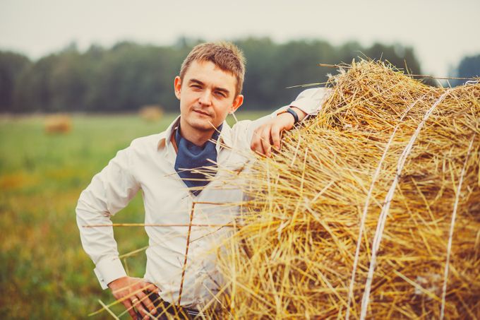 Образ жениха для свадьбы в американском стиле: синие джинсы, белая рубашка с синим шейным платком