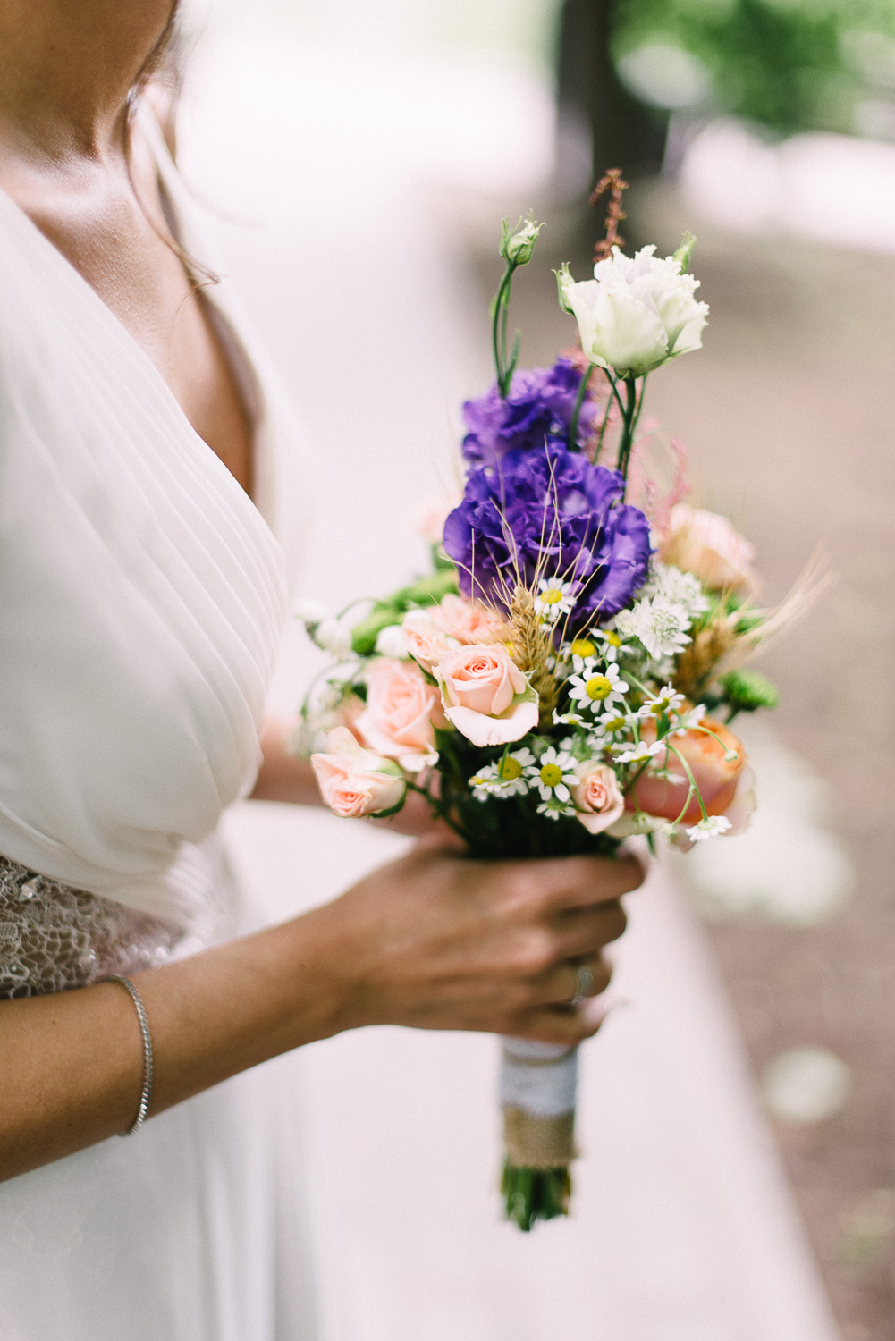 Букет невесты из розовых роз, белых ромашек, белых и фиолетовых эустом
