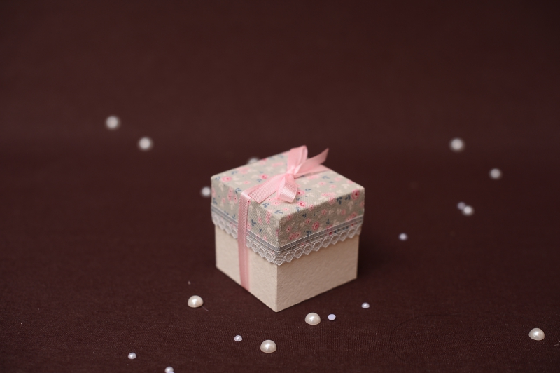 Розовая пестрая бонбоньерка с розовой ленточкой на коричневом фоне.
